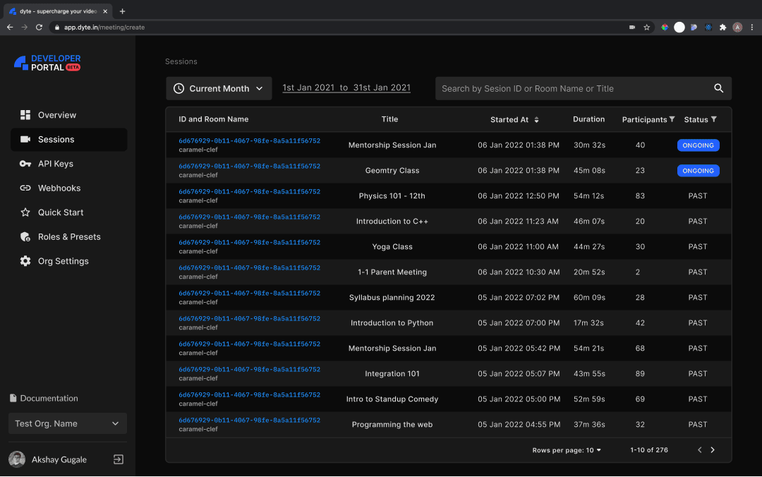 past sessions. You can search and filter